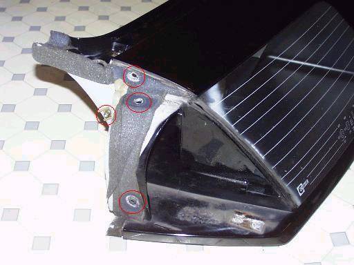 9. Once the indicators are removed 2 more T30 screws will be revealed (each side). Remove them - and the very-easy-to-miss T30 screws (1 each side, accessible from inside) securing the upper outside edges of the nosecone to the upper front corners of the wings. I've included a photo so you can see the locations of these fasteners.