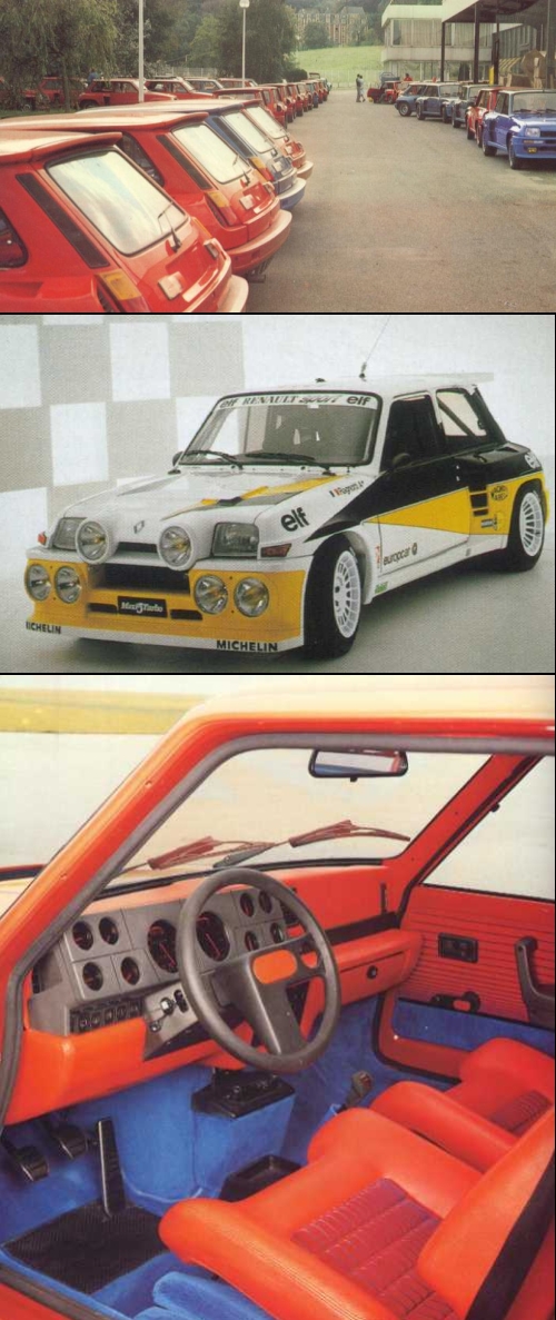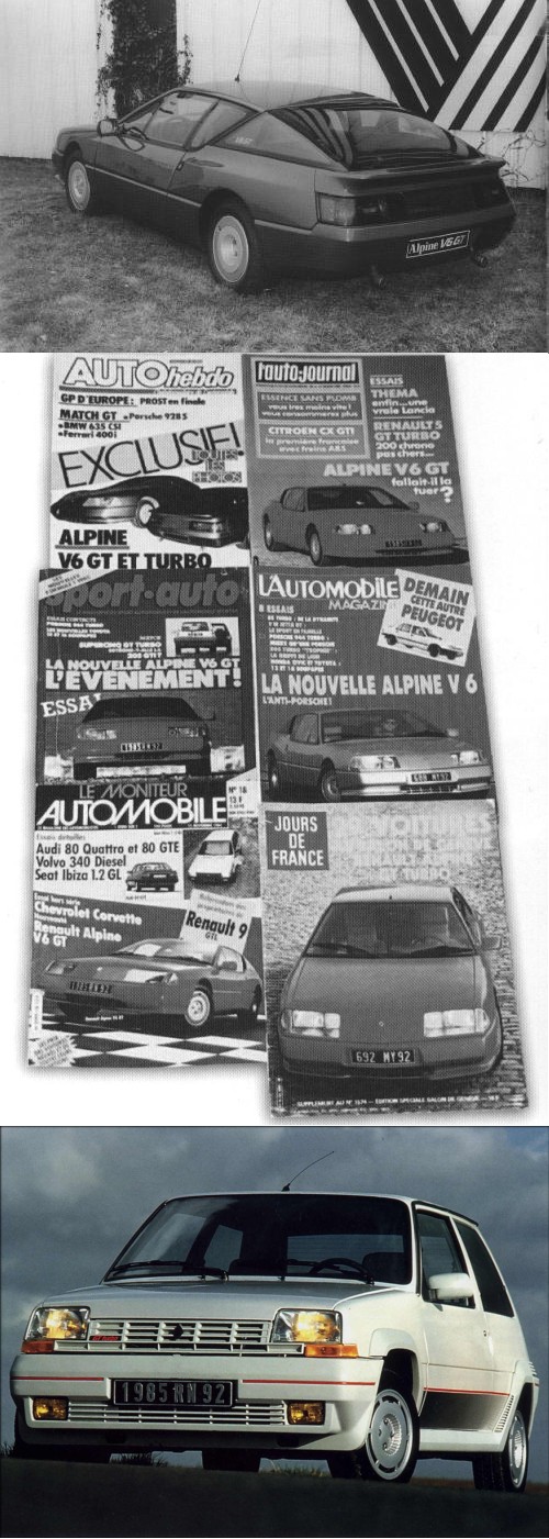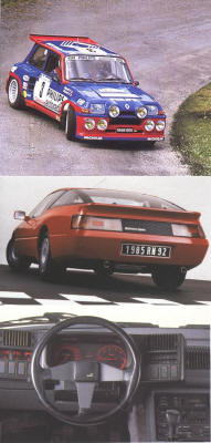 of plastic components Alpine V6 GT 2+2 Coupe Engine 2.8 litres, 160bhp - 235 km/h, 0 to 100 km/h in 8s - 1000 standing start in 28s. The Renault 5 Turbo gained 85 victories and J Ragnotti was crowned French Rally Champion The replacement for the R5 Alpine Turbo, the Super 5 GT Turbo was the most powerful in its class with 115bhp: Max Speed 200 km/h and 15.8s for the 400 standing start.