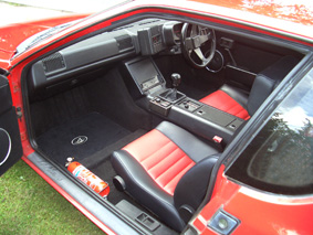 late model with black leather seats and the same metallic red as the Le Mans.