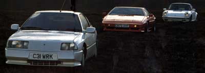 On the winding roads of Exmoor we had two full days there to play with the cars the Esprit was always invigorating. Its sharpness. The engine response. The grip. Yet it never proved as pleasurable as the Porsche. It doesn't have the nimbleness, or the smallness. It always feels a wide car which it is and bulk is always a nuisance when you're trying to stomp along. The engine, although good for a turbo, doesn't react with the immediacy of Porsche's air-cooled six. And it does not provide the same usable power as does the Renault's engine, with its beefier mid-range urge. Then there are other things about the Esprit which would get on our wick after a while. The tacky finish the leather was starting to peel off the dashboard in places. Those big unsightly panel gaps. The cheap switchgear and catches much of the old British Leyland fitments (the interior door catches, for instance, are off the Austin 1800; the air vents are from the Allegro Series 3). There's still a kit car feeling about the Lotus, and a feeling of fragility that would worry us, were we to fork out £25,000.