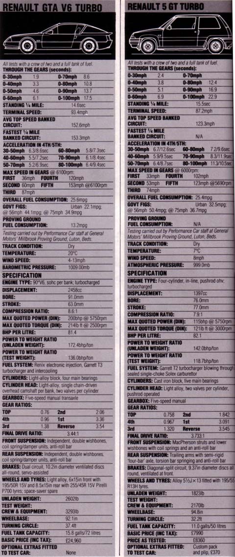 If it's driving pleasure, handling and performance you are looking for - a car that can cover the ground quickly - is it worth buying something less than practical when you can have the versatility of a hatchback? It was Renault who gave us the means to find out. La Regie virtually invented the hatchback, and their rip-roaring £7990 5 GT Turbo won our hot hatches contest last year. With its turbocharged 1397cc engine turning out 115bhp and 121lb ft of torque, it lapped Millbrook at 123.3mph and hit 60mph from standstill in just 6.9 seconds, while its roadholding and handling earned almost universal praise. But Renault also do a low, sleek supercar, the £24,960 GTA V6 Turbo, whose boosted 2458cc endows it with 200bhp and 214lb ft of torque. Our fairly new one took the Millbrook bowl at 152.6mph. You can see 60mph in just 6.1 seconds in what the French can call the Alpine V6 Turbo. And it looks the part!
